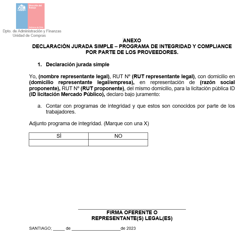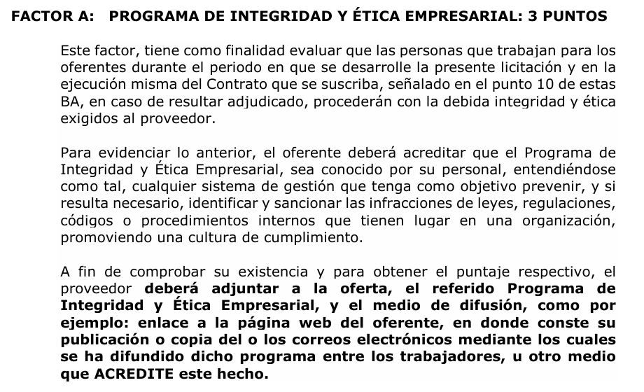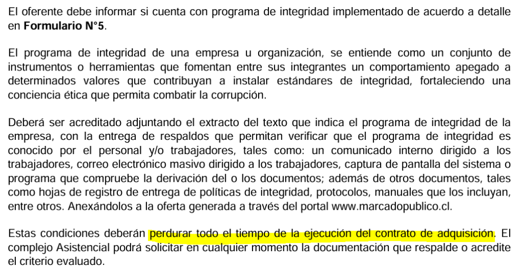 - Licitación ID: 1058095-10- LR25. En este caso podemos constatar que se definió el compliance y se incorporaron verificadores que evidencian un enfoque sistémico en los Programas de Integridad. En línea con los requisitos de la Directiva 31 Chilecompra Código de Ética para proveedores del Estado en compras públicas. Si se adjudica una oferta que no haya adjuntado el programa requerido, igualmente deberá acreditarse su existencia antes de la suscripción del respectivo contrato.