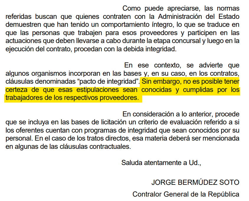 La investigación ha ido evidenciando un mayor grado de comprensión de los requisitos ya que se han incorporado en las bases administrativas un mayor detalle sobre el cumplimiento de los Programas de Integridad. Este elemento es el punto final del dictamen de Contraloría que señalamos anteriormente.