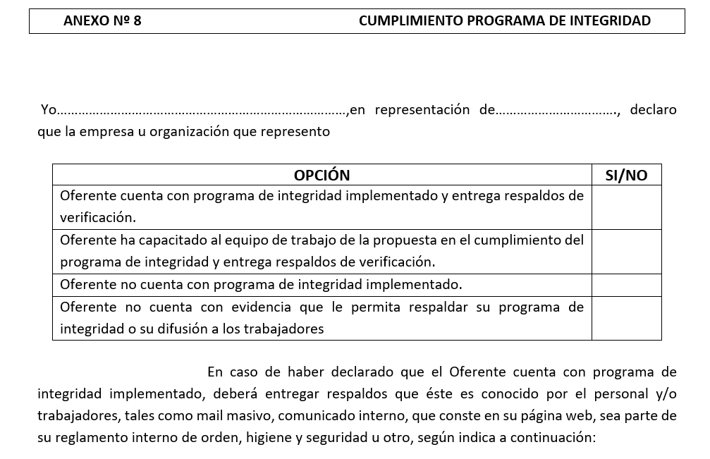 Se solicita entonces, que los Programas de Integridad sean acompañado de evidencia de que el programa es conocido por los trabajadores. Especificando los respaldos verificar que el programa es conocido al momento de presentar la propuesta: comunicado interno, mail masivo o impresión de pantalla del sistema o programa, u otro.